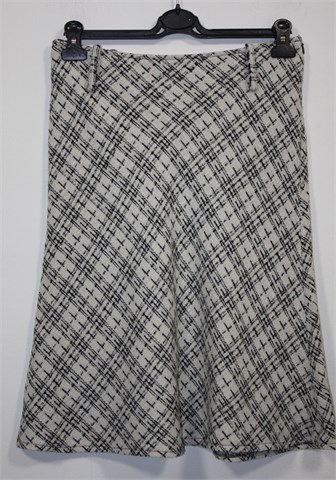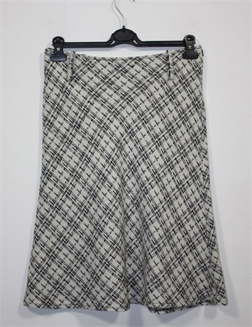 FVR suknja bijele boje sa crnim prugastim uzorkom, materijal je kao štof/tvid. Bočni cif, široka pasica za remen. Podstava je odrezana, suknja je rastezljiva.