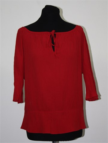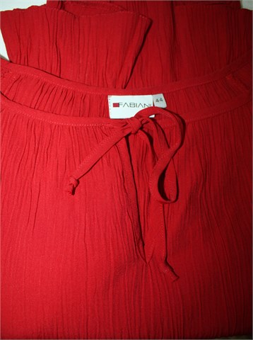 Fabiani bluza sa poludugim rukavima, ugodne tamnije crvene boje. Blago stegnuta gumicom pri dnu rukava i na pasici. Materijal je blago zgužvan i malo rastezljiv.