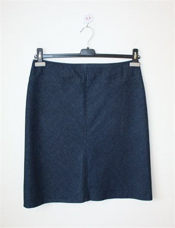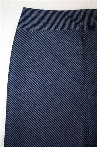 Facit traper suknja sa crnim plišastim prugama (uzorak pruga vidljiv na slikama). Stražnji cif, podstavljena. Malo rastezljiva.