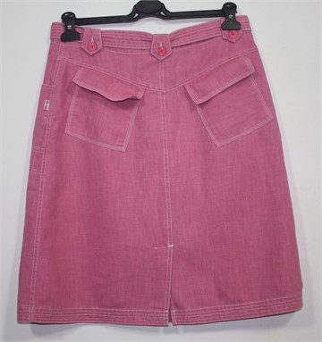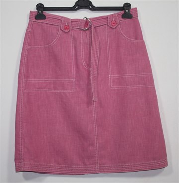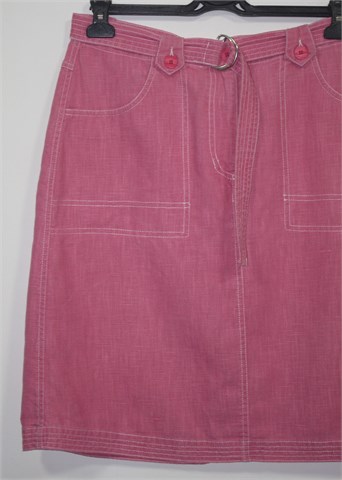 Falino suknja od lana, roze boje. Prednji cif i kopčanje, pasica za remen sa pripadajućim remenom. Prednji bočni, stražnji džepovi sa preklopom. Mali stražnji prorez.