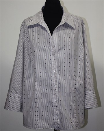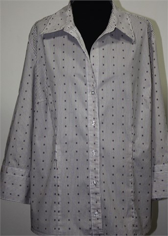 Fashion Bug košulja sa poludugim rukavima, bijele boje sa prugama i sitnim uzorkom (u dvije nijanse ljubičaste boje). Prednje kopčanje, prednji i stražnji ušitci (blago strukirana). Rastezljiva.