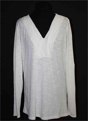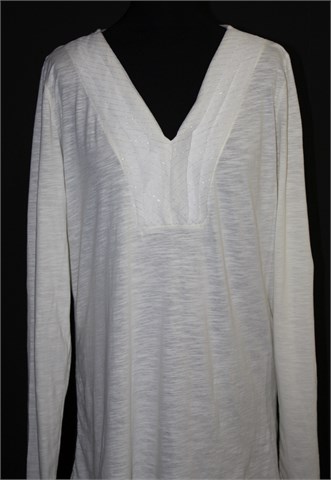 Fashion bug majica sa dugim rukavima, prljavo bijele (žućkasta nijansa) boje. Sa prednje strane ukrasni materijal našiven u redovima, protkan srebrnim nitima. Materijal je mekan, tanak i blago providan. Rastezljiva.