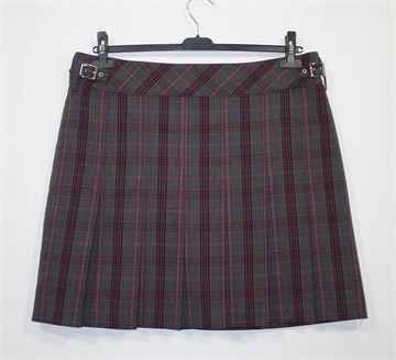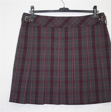 Fashion Bug suknja prošarano sivo-ciklama roze boje sa prugasto-kariranim uzorkom (boje i uzorak vidljivi na slikama). Stražnji cif, bočne kopčice i više ukrasne ušice za remen u pasici. Sa prednje strane su faldice (ravne, nisu izboćene). Materijal je tanji i lagan (tanji štof), blago rastezljiv.