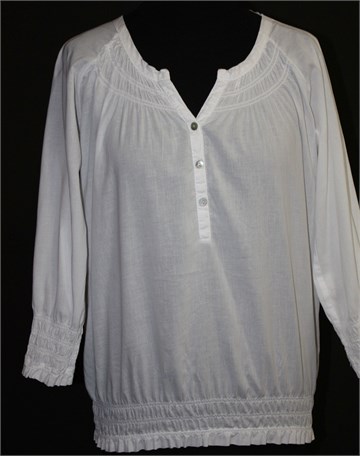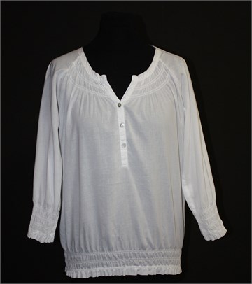 Fashion club bluza sa poludugim rukavima, bijele boje. Prednje kopčanje sa ukrasnim sedefastim gumbima, prošivena gumicama na krajevima rukava i pasici. Lagan i prozračan pamuk, blago providan.
