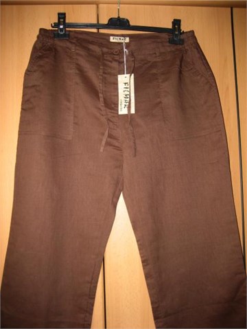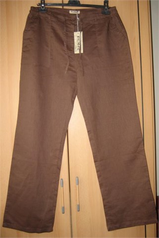 Lagane hlače od mješavine lana i pamuka. Prednji cif i kopčanje, pasica za remen. U pasicu je ušivena gumica i prilično su prilagodljive u struku, također vezanje i sa vezicom. Prednji duboki džepovi. Ušitci, šire nogavice. Dublji model.
