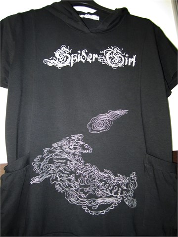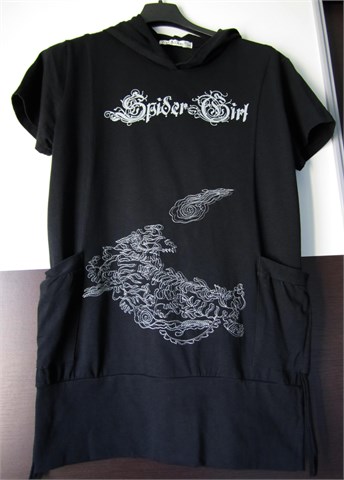Filmar duža majica/tunika crne boje, sa kapuljačom i bočnim džepovima (na džepovima su špagice koje se mogu stegnuti). Sa prednje strane print ukrašen cirkonima i ukrasna aplikacija od bijelog konca. Mekan i rastezljiv pamuk.