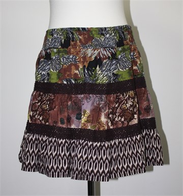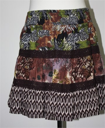 Fire Los Angeles pamučna suknja sa šarenim uzorkom (boje kao na slici). Prošivena gumicama u struku pa je širina prilagodljiva. Ukrasne heklane trake smeđe boje našivene sa prednje i stražnje strane. Lagan i prozračan pamuk.