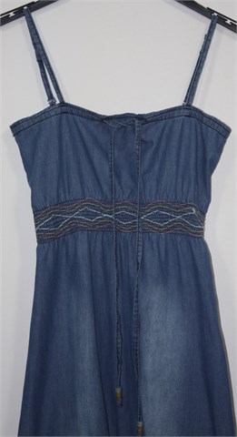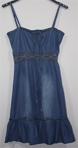 Fishbone haljina od trapera, mjestimično ispranog izgleda (tvornički). Tanke, prilagodljive naramenice (kao na grudnjaku), gumice na leđima i u struku. Lagan i mekan pamuk.