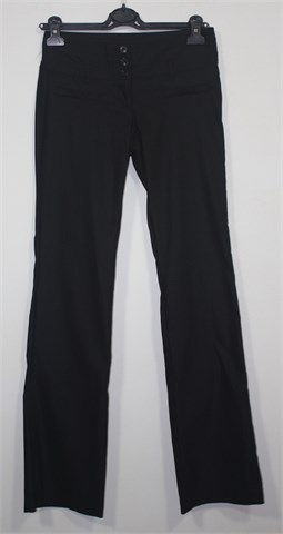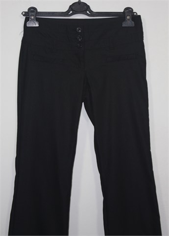 Fishbone hlače jednostavnog i vječnog kroja, crne boje. Prednji cif i gumbi, uska pasica za remen. Prednji i stražnji lažni džepovi. Rastezljive.