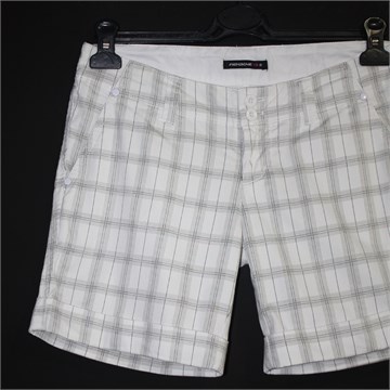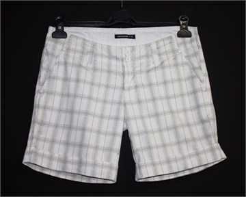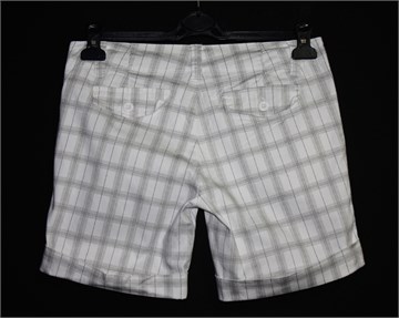 Fishbone kratke hlače bijele boje sa crno-sivim prugasto-kariranim uzorkom (boje i uzorak kao na slikama). Prednji cif i kopčanje, pasica za remen. Prednji bočni, stražnji ukrasni džepovi. Blago rastezljive.