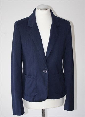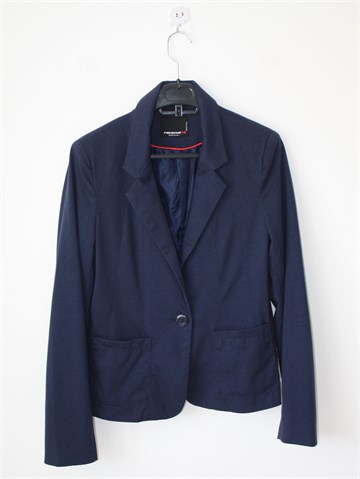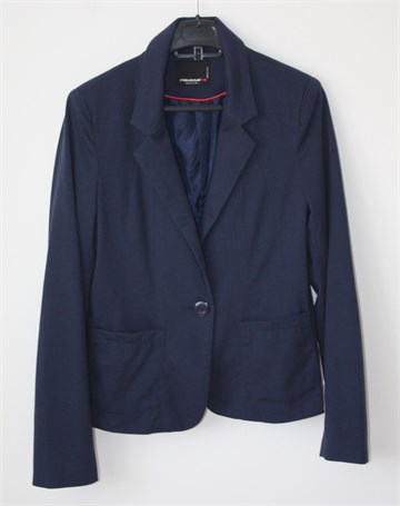 Fishbone sako/blazer tamno plave boje. Prednje kopčanje sa jednim gumbom, bočni džepovi. Jastučići u ramenima, podstavljen plavom podstavom. Blago rastezljiv.
