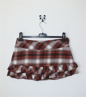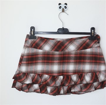 Fishbone kratka suknja sa kariranim uzorkom (boje kao na slikama). Bočni cif i gumbići, podstavljena. Na dnu volančići u dva reda. Deblji i mekani pamuk.