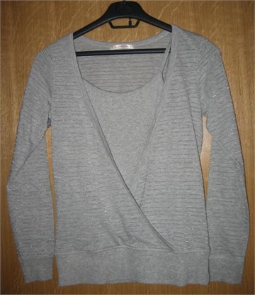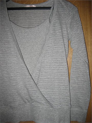 Majica dugačkih rukava sa ušivenim sivim topićem. Svijetlo sive boje sa srebrnim prugicama. Na majici piše veličina M, odgovara veličini 38/40.  Mekana i rastezljiva.