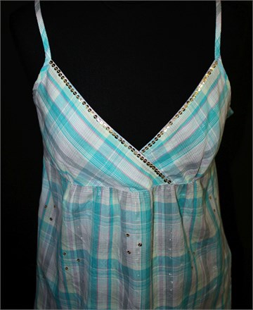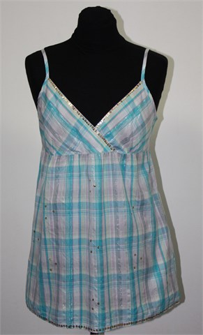 Fishbone topić sa podesivim naramenicama, bijele boje sa karirano-prugastim uzorkom (boje i uzorak vidljiv na slikama), mjestimično protkan sjajnim nitima i ukrašen našivenim šljokicama. Bočne trakice za vezanje. Tanji i prozračan pamuk.