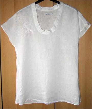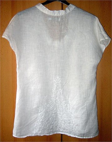 Neobičnog izreza. Našivene aplikacije na prednjoj strani. Otraga ukrasni prošivi od konca. Nije rastezljiva.