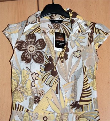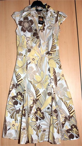 Prekrasna i lagana ljetna haljina, vrlo prozračna. Mali rukavići i kragnica, prednji dio vizualno na preklop. Rezana u struku, prema dolje se širi. Haljina ima bočni cif. Nije rastezljiva.