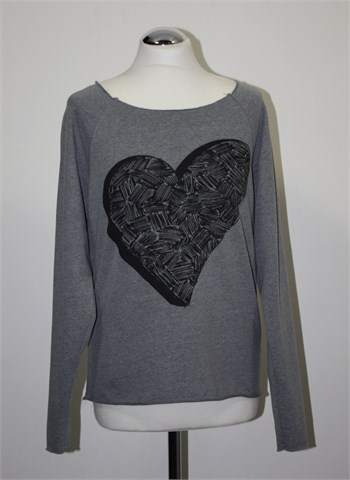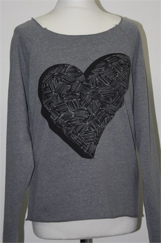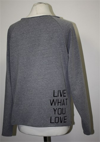 Forever 21 (I Love H81) oversized majica sa dugim rukavima, sive boje sa prednjim i stražnji printom (vidljivo na slici). Mekan, tanji i blago rastezljiv materijal (kao za tanje trenirke). Šira oko ramena.