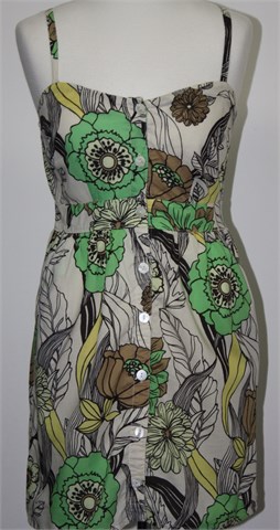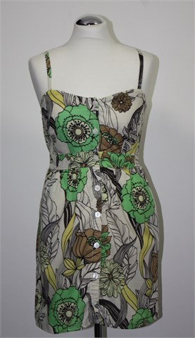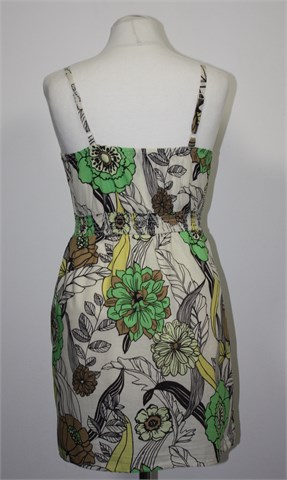 Forever 21 kratka haljina/tunika svijetlo bež/prljavo bijele boje sa šarenim cvjetnim printom (boje i uzorci kao na slici). Tanke, podesive naramenice, kopčanje sa prednje strane. Prednji bočni džepovi, podstavljena u donjem dijelu. Sa stražnje strane prošivena gumicama pa je širina prilagodljiva (vidjeti mjere). Tanji i lagan pamuk.