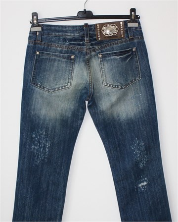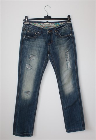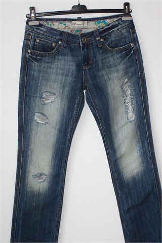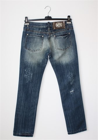 Fracomina traper hlače plave boje sa diskretnim sjajem, cijele imaju used look. Oštećenog izgleda sa prednje i stražnje strane, sa prednje strane nogavica oderane (preko izderanog dijela idu srebrne niti, neke su se razdvojile). Nemaju elastina, nisu rastezljive. Niski struk (plitki model), vidjeti mjere.