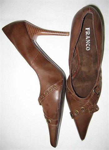 Prekrasne sandale tamno smeđe boje, ukrasi na prednjoj strani. Peta imitacija drveta, visine 10 cm.