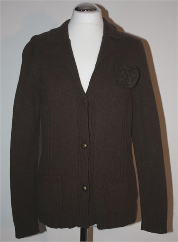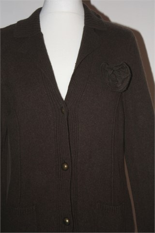 Frank Walder vuneni kardigan/vesta na kopčanje tamnije smeđe/maslinaste boje. Prednje kopčanje, mali džepići (još uvijek zašiveni). Na prsima je zašiven ukrasni cvjetić. Debelo i toplo vuneno pletivo.