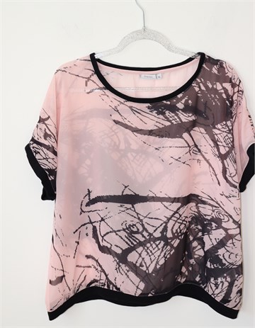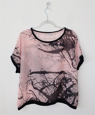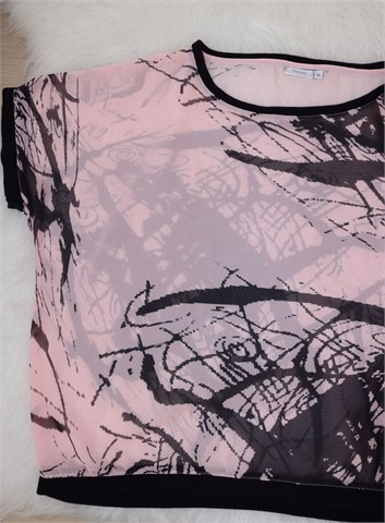 Fransa bluza sa kratkim rukavima, roze boje sa crnim printom. Ovratnik, rubovi rukava i pasica pamučni materijal. Providna, nije rastezljiva.