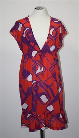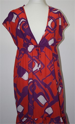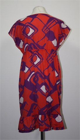 Fransa haljina/tunika bez rukava, tamnije narančaste boje sa bijelo-ljubičastim printom (uzorak kao na slikama). Prednji veći otvor (do gumice ispod prsiju), ispod prsiju gumica i ukrasna mašnica. Na dnu mali volančić. Mekan, tanak i prozračan pamuk.