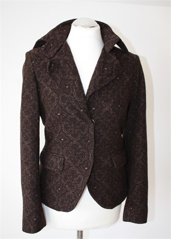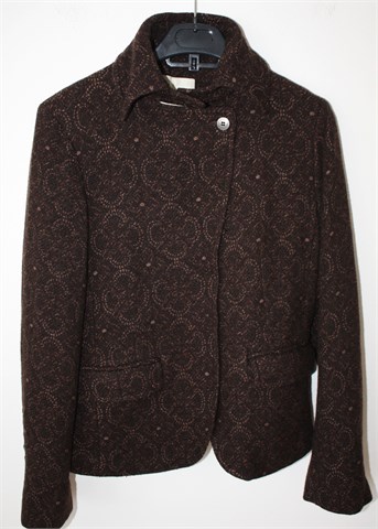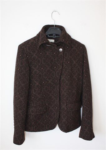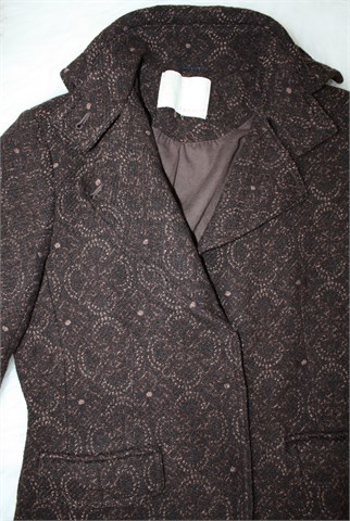 Fransa kaputić tamno smeđe boje sa svijetlo smeđim uzorkom (vidljivo na slikama). Prednje kopčanje sa tri velika drukera, bočni džepovi sa preklopom (zašiveni). Podstavljen, gumbići na krajevima rukava.