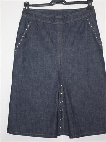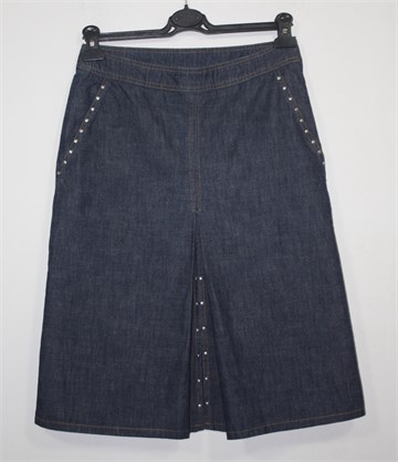 Friday suknja od trapera srednje plave boje. Bočni džepovi i prednji otvor su ukrašeni zakovicama. Suknja ima bočni cif.