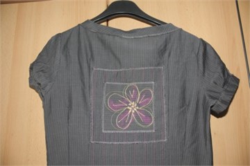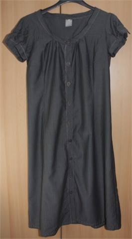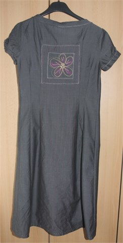 Unikatna i šivana haljina, Friends Design. Haljina je tamno sive boje sa diskrenim svijetlijim prugama. Kopčanje na prednjoj strani. Mali rukavići sa prorezima. Sa stražnje strane ukrasni prošivi od konca (boje ciklame), također i našivena aplikacija od konca i umetnutih materijala. Ušitci, blago strukirana.