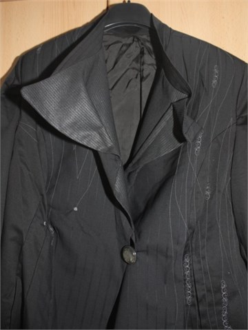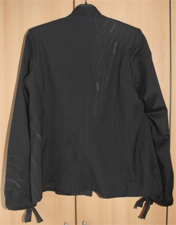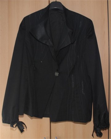 Napravljen od tri materijala različitih dezena koji se prekrasno nadopunjavaju. Izvezene prekrasne aplikacije od tamno sivog konca sa prednje i stražnje strane i na rubovima rukava. Strukiran i podstavljen. Kopčanje na jedan prednji gumb sedefasto sive boje. Na rubovima rukava uvezene prekrasno izvezene špagice za zatezanje. Veličinu procjenjujem na XL (vidjeti mjere).