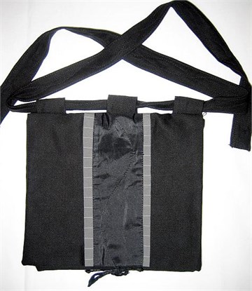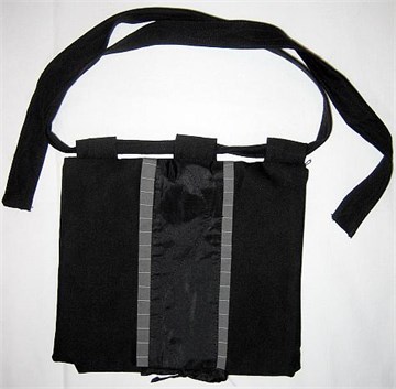 Preslatka torbica koja se veže vezicama oko struka (kao remen). Na preklop, vezanje na malu vezicu. Na prednjoj strani umetak od svilene tkanine, obrubljeno sivim materijalom. Unikat, šivano.