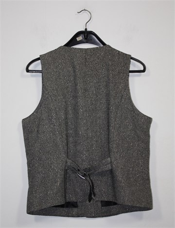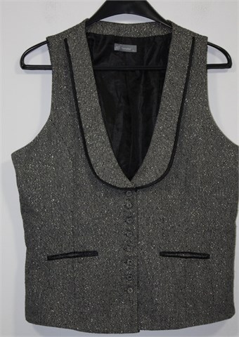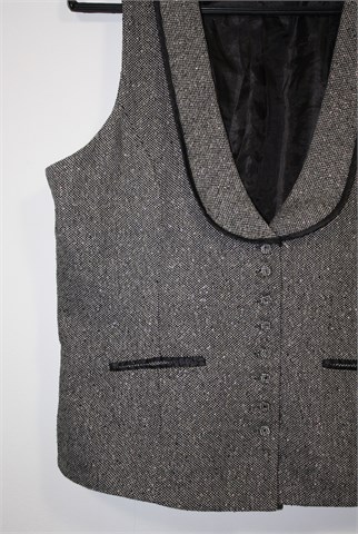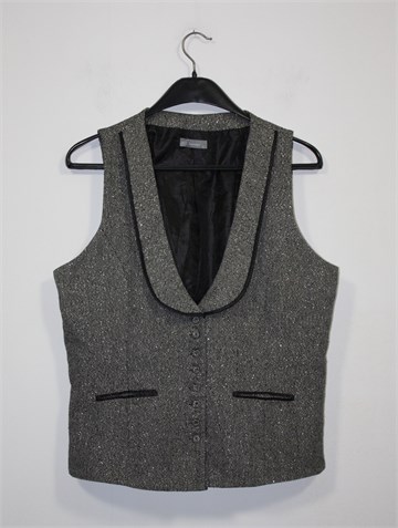 Friendtex prsluk prošarano crno-bijele boje, protkan sjajnim zlaćanim nitima pa je blago šljokav. Prednje kopčanje sa malim gumbima, bočni ukrasni džepovi. Sa stražnje strane regulacija širine., podstavljen.