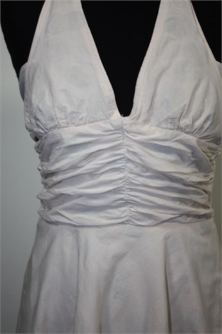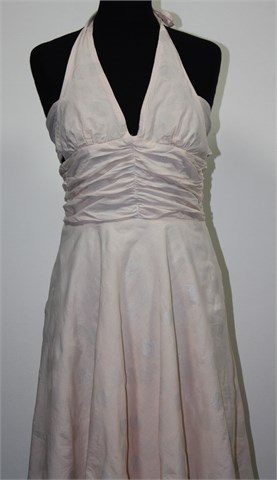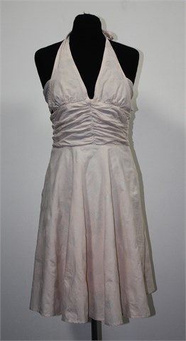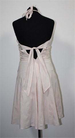 Funky People predivna i neobična haljina svijetlo roze boje sa diskretnim sivo-srebrnim uzorkom na materijalu (vidljivo na slici). Stražnji cif (na slici nije zatvoren do kraja), vezanje oko vrata i dodatne trake za vezanje preko leđa (vidljivo na slici). Podstavljena pamučnom podstavom. Lagan i mekan pamuk.