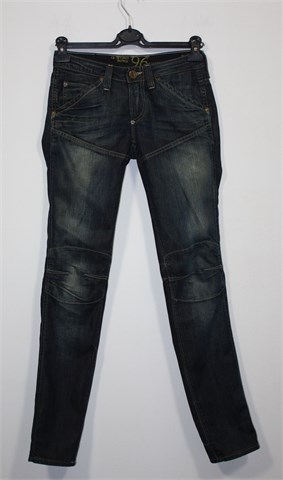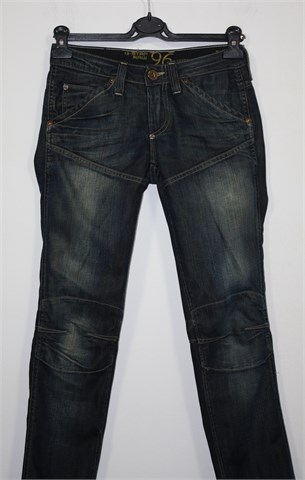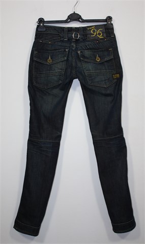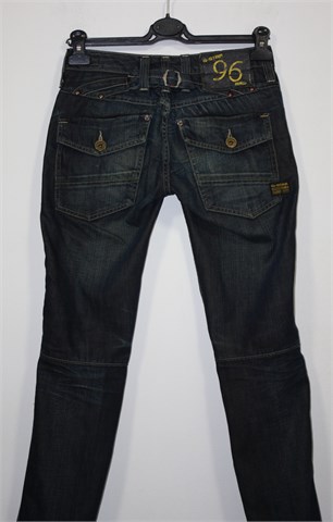 G-Star Raw traper hlače (original) tamnije plave boje ispranog izgleda (tvornički used look). Prednji cif i kopčanje, pasica za remen. Prednji bočni, stražnji džepovi na preklop sa gumbom. Nisu rastezljive, pamuk je čvrst i vrlo kvalitetan. Sva "šteta" na njima je originalna i dio tvorničkog used looka.