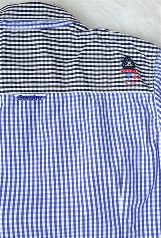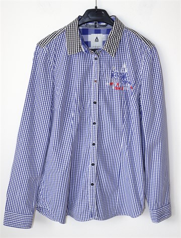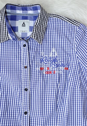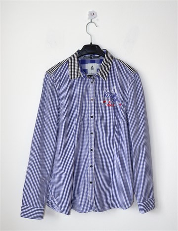 Gaastra košulja sa dugim rukavima i kockastim uzorkom u kombinaciji bijele i plave boje (dio materijala na ramenima i gornji dio leđa kockasta kombinacija crne i bijele boje). Prednje kopčanje, strukirana. Aplikacije sa prednje i stražnje strane (vidljivo na slikama). Nije rastezljiva.