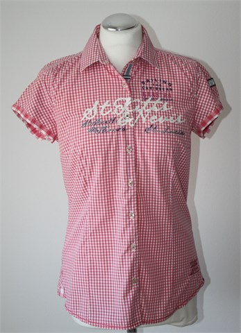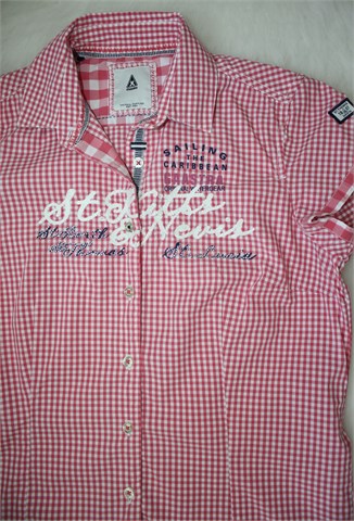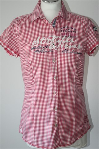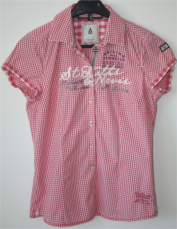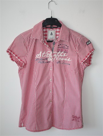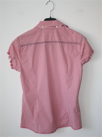 Gaastra košulja sa kratkim rukavima, kockasti uzorak u kombinaciji roze i bijele boje. Prednje kopčanje, aplikacije sa prednje strane (vidljivo na slikama). Blago strukirana, nije rastezljiva.