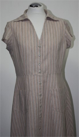 Gaia prugasta haljina, kombinacija lana i pamuka. Boja je svijetlo sivo-bež sa prugama u svijetlim tonovima. Prednji džepovi. Gornji dio krojen kao košulja, donji dio se blago širi. Prednje kopčanje cijelom dužinom.