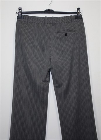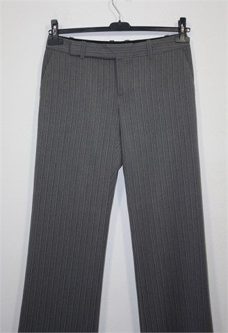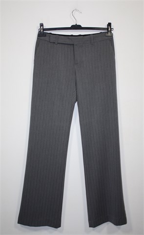 Gap stretch hlače sive boje sa prugama, lijepog klasičnog kroja. Prednji cif i kopčanje, pasica za remen (sa ukrasnim remenčićem sa prednje strane). Prednji bočni džepovi i jedan stražnji skriveni džepić sa gumbom. Tanj i mekan materijal, rastezljiv.