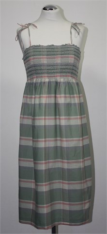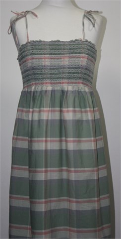 Gap ljetna haljina sa tankim naramenicama (vežu se u mašnice), karirano-prugasti uzorak u plavoj, zelenoj, rozoj i bijeloj boji (boje kao na slikama). Gornji dio sa obje strane prošiven gumicama pa je širina prilagodljiva (vidjeti mjere). Podstavljena pamučnom podstavom. Tanja i prozračna.