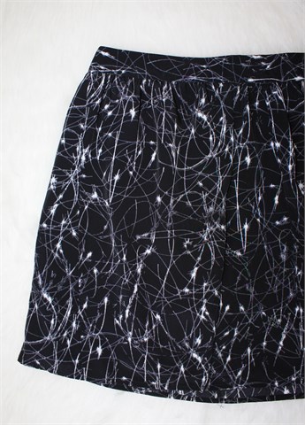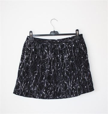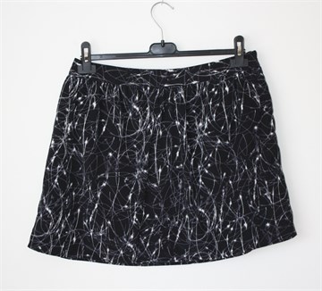 Gap suknja crne boje sa printom (print je sivo-bijele boje, uzorak je vidljiv na slikama). Bočni cif i gumbić, podstavljena. Tanja i lagana, nije rastezljiva.
