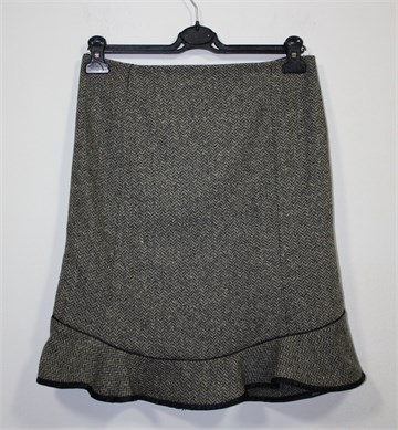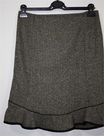Gap suknja od štofastog materijala, prošarano crno-bijele boje sa uzorkom na tkanini. Mali volančić na dnu, ukrasne trakice (mrvicu se odšila trakica sa prednje strane ali nije primjetno). Stražnji cif, podstavljena.