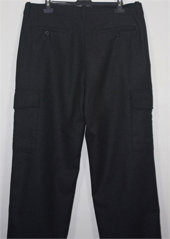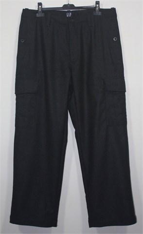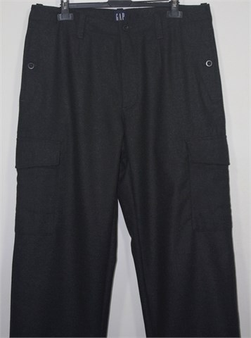Gap hlače prošarano sive boje, većinski sastav je vuna pa su vrlo tople i mucaste. Prednji cif i kopčanje, pasica za remen. Prednji bočni, stražnji džepovi sa gumbićem. Bočni džepovi na nogavicama (cargo model). Podstavljene do cca pola dužine.