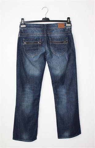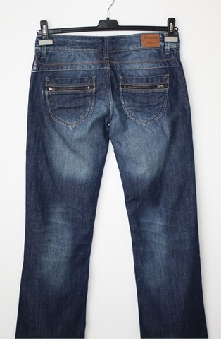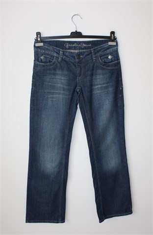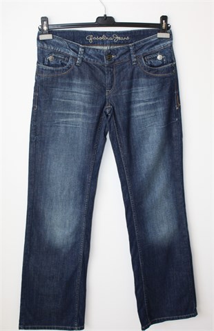 Gasolina Jeans traper hlače plave boje, mjestimično ispranog izgleda (used look - vidljivo na slikama). Prednji cif i kopčanje, pasica za remen. Prednji bočni, stražnji džepovi sa dodatnim džepićem sa cifom na džepu. Malo rastezljive, plitki model (vidjeti mjere).