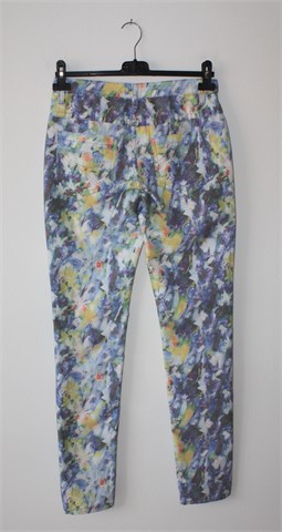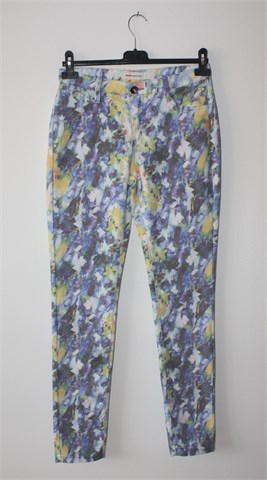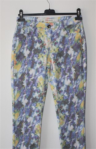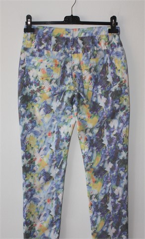 Geisha Collection traper hlače od tankog materijala, prošarani uzorak (boje i uzorak kao na slikama). Prednji cif i kopčanje, pasica za remen. Prednji ukrasni, stražnji klasični džepovi. Uske nogavice (nisu za jače listove ili bedra), vrlo blago rastezljive.