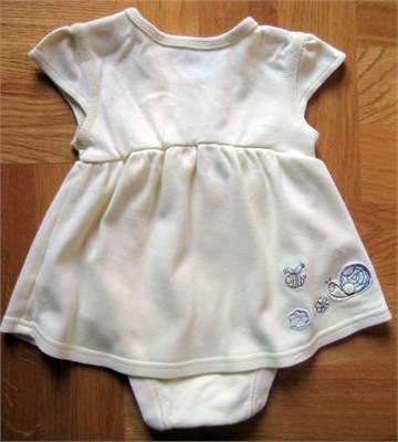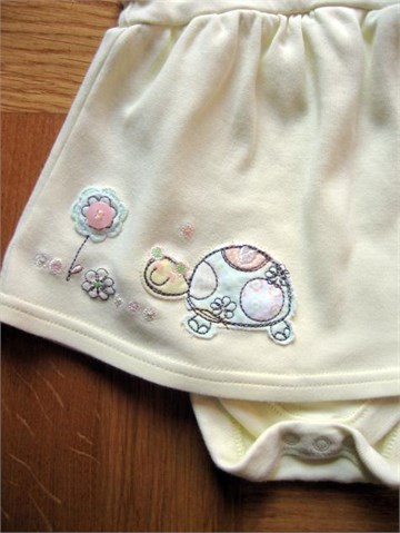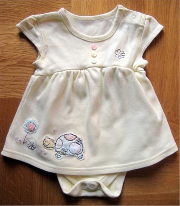 Preslatki body-haljinica svijetlo žute boje sa ukrasnim gumbićima i aplikacijama sa prednje i stražnje strane. Kopčanje sa drukerima između nogu i na ramenu.