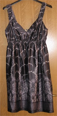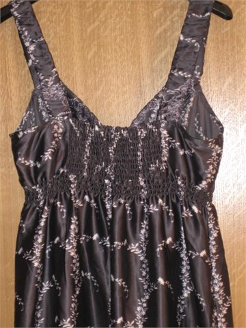 Prekrasna haljina boje kao na slici (teško opisiva boja, nešto između zagasito ljubičaste i sive boje) sa detaljima u bijeloj i lila boji. Tanke naramenice (fiksne), ispod grudi i na leđima gumica i "žabice" za boje pristajanje. Širina u prsima je vrlo prilagodljiva. Vrlo lagana i lepršava, idealna za ljeto :D