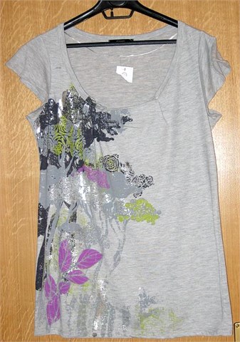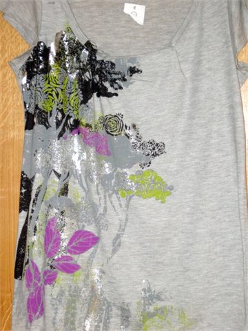 Prekrasna majica/tunika svijetlo sive boje sa printom ljubičasto/zeleno/tamno sivo/srebrne boje. Kratki rukavići, ukrasni ušitci na dekolteu. Vrlo lagana i prozračna, idealna za ljeto :)