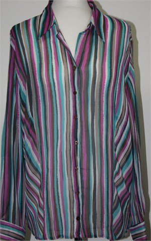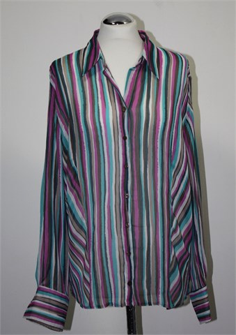 Gerry Weber prugasta košulja sa dugim rukavima, providan materijal. Prednje kopčanje, lagana i prozračna. Materijal je blago zgužvan pa je odlična za održavanje :) Blago rastezljiva.