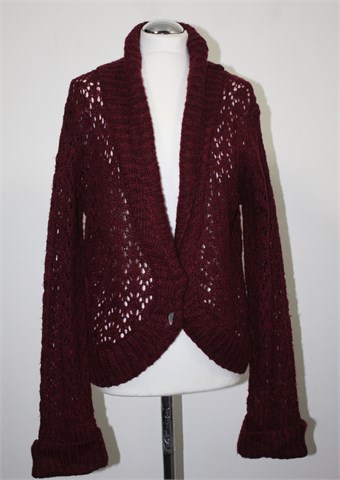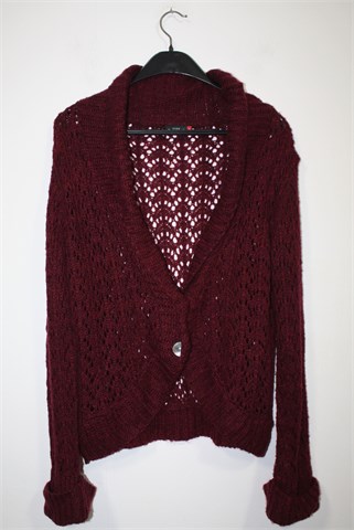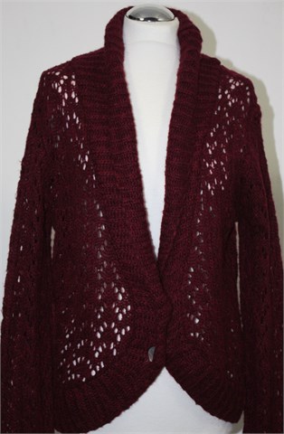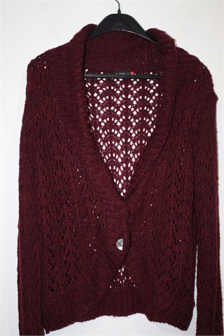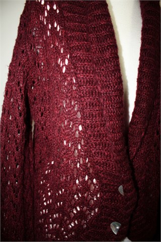 Gina Benotti vesta sa kopčanjem/kardigan prošarano bordo/tamno crvene- ljubičaste boje. Prednje kopčanje sa dva gumba (ukrasna - sedefasta), rupičasto i mucasto pletivo. Rastezljiva.